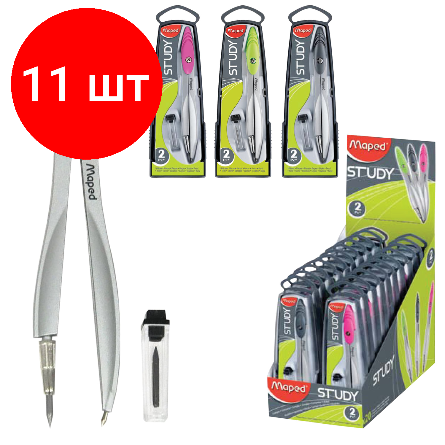 Купить Комплект 11 шт, Циркуль MAPED"Study", 120 мм, металлический, грифель 2 мм, ассорти, пенал с европодвесом, 119450