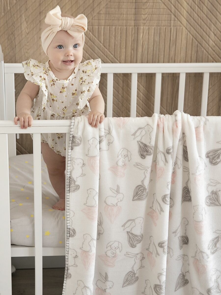 Плед для новорожденного 100х118 пушистый детский в кроватку коляску Tessolo Home, "Зайчики и сердечки", белый интересное: