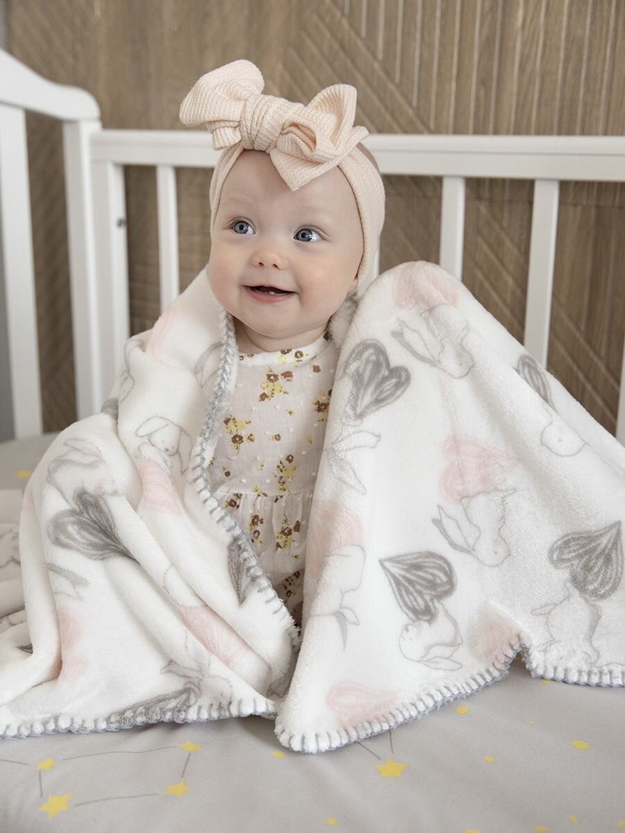 Плед для новорожденного 100х118 пушистый детский в кроватку коляску "Зайчики и сердечки", белый для девочки