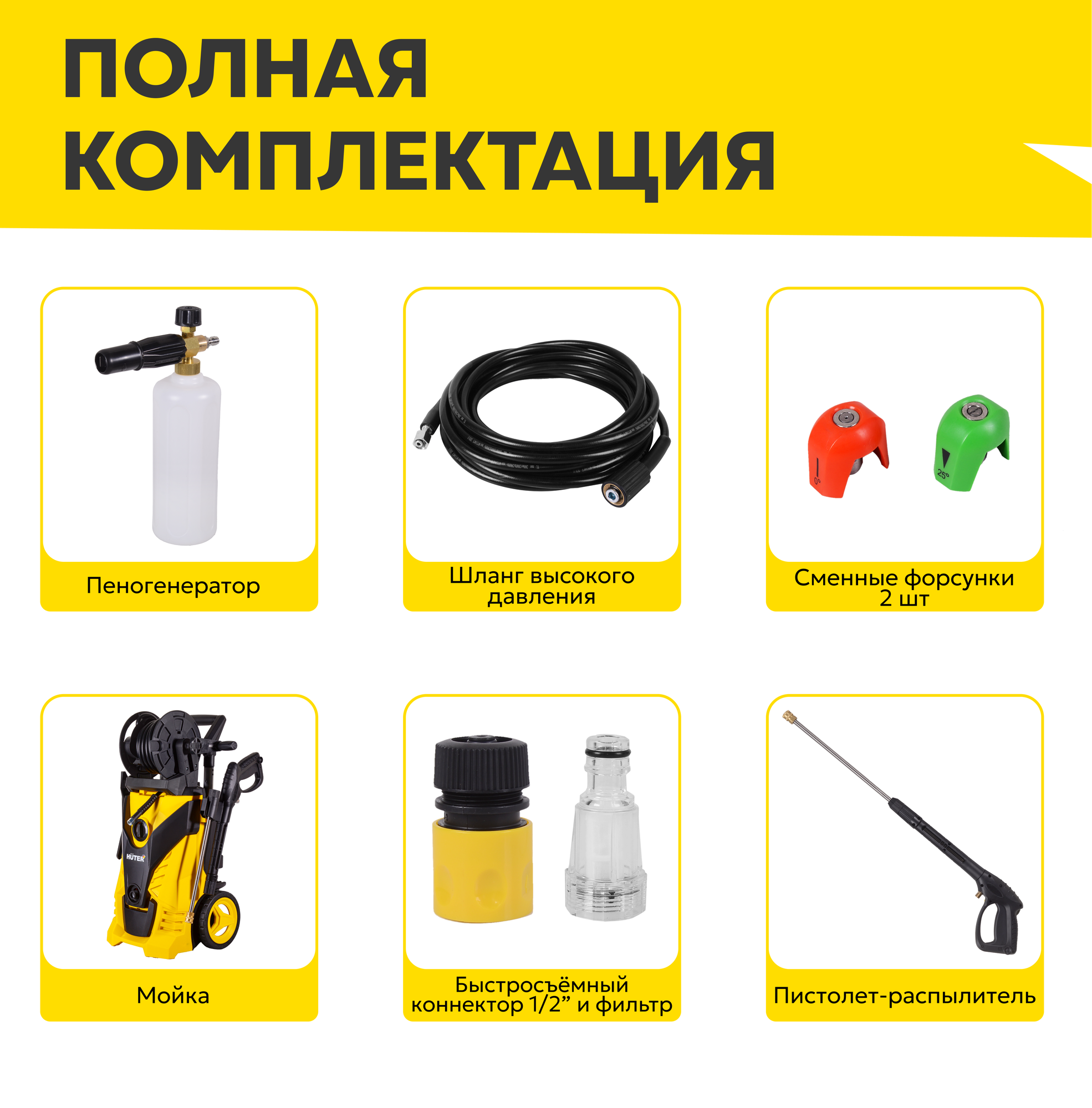 | Подробная комплектация | Мойка высокого давления; Пистолет-распылитель разборный; Шланг высокого давления; Пеногенератор; Игла для очистки сопла; Фильтр для очистки воды; Быстросъёмный коннектор для шланга подачи воды; Руководство по эксплуатации. |