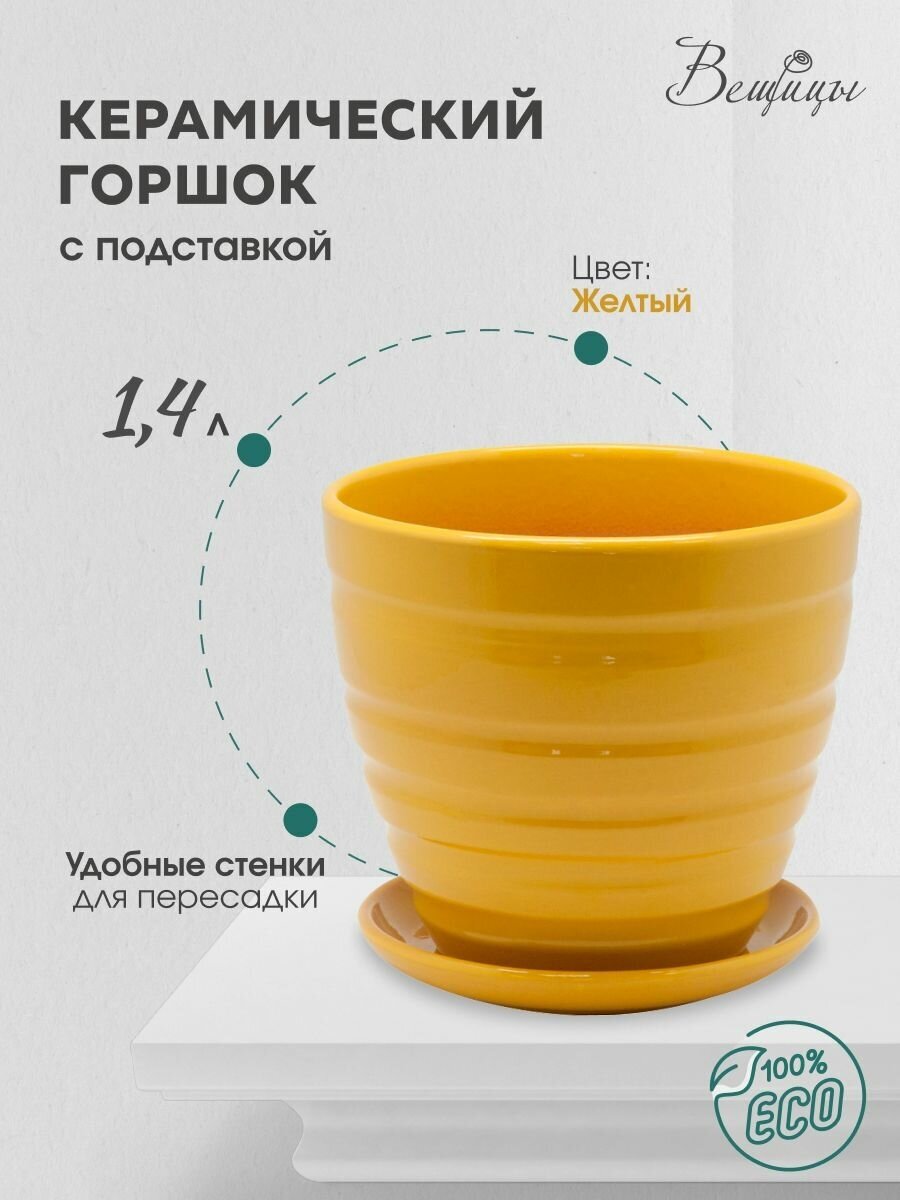 Керамический горшок цветочный ВеЩицы с подставкой блюдцем / объем 1,4 л, цвет желтый интересное: