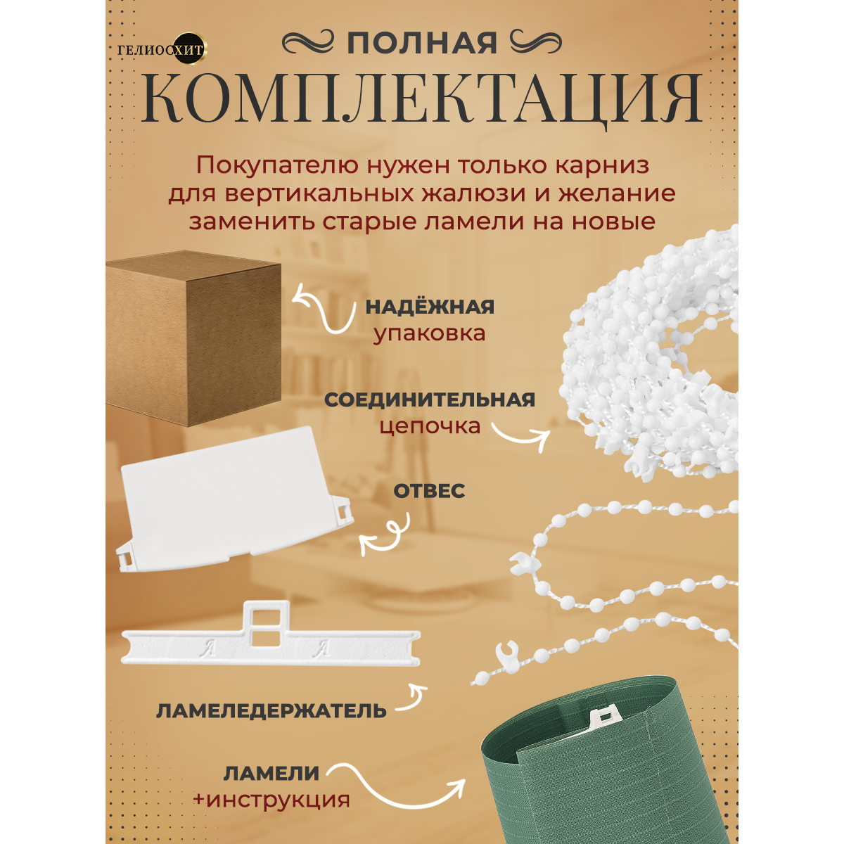 СохранитьЛамели для вертикальных жалюзи 15 шт высотой 155 см оливкового цвета, карниз приобретается отдельно, гелиосхит. интересное: