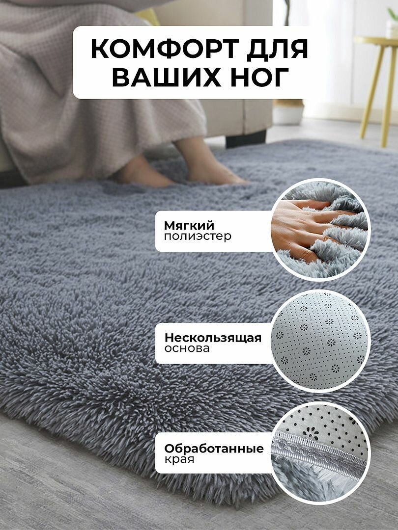 Ковер на пол для комнаты с ворсом 150х200 см, мягкий пушистый меховой в гостиную, спальню, зал и детскую антискользящий, серый