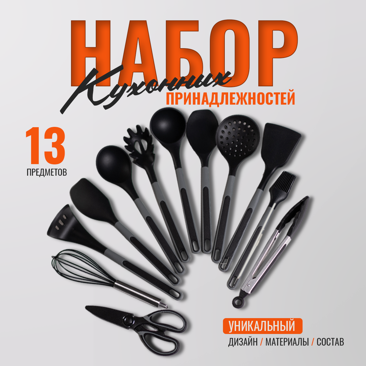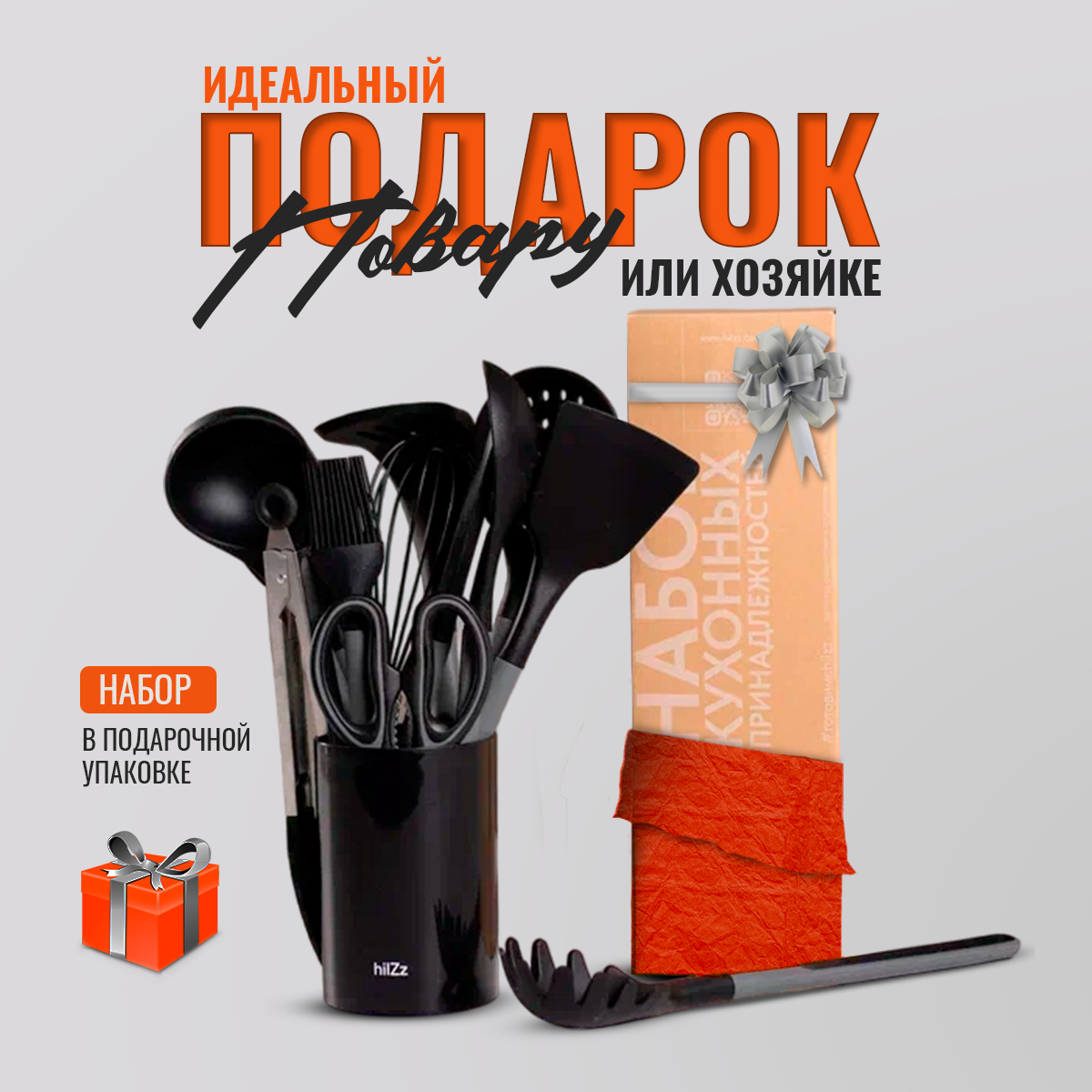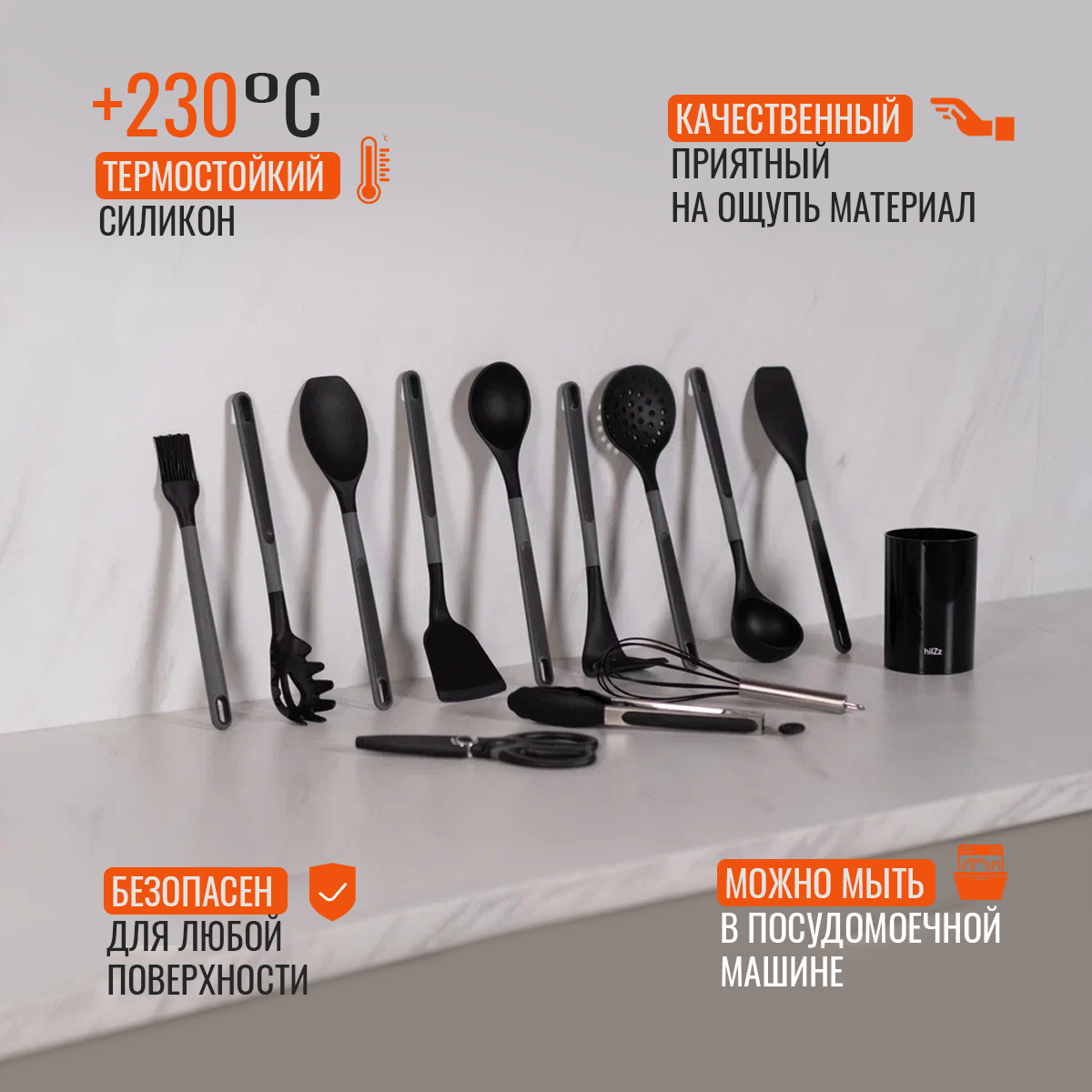 Набор кухонных принадлежностей HILZZ 13 предметов из силикона с подставкой, черно-серый интересное: