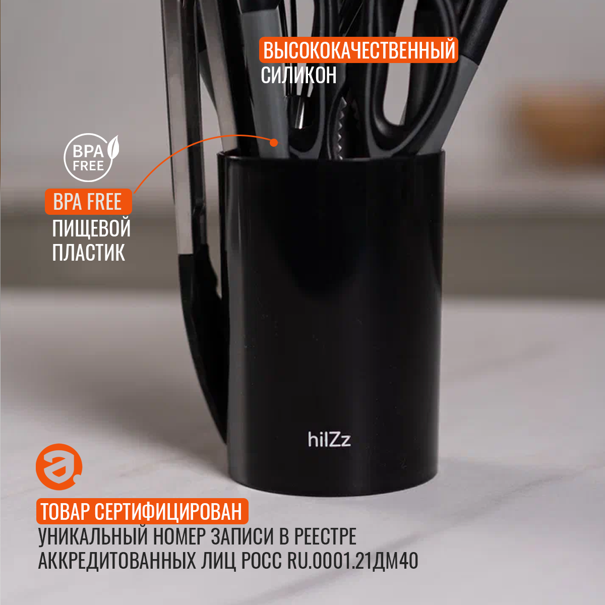 Набор кухонных принадлежностей HILZZ 13 предметов из силикона с подставкой, черный