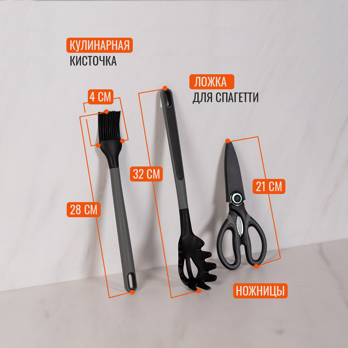 | Комплектация | Шумовка, Щипцы, Ножницы, Подставка, Половник, Лопатка, Шпатель кулинарный, Венчик, Кисточка для масла, Картофелемялка, Ложка, Ложка для спагетти |