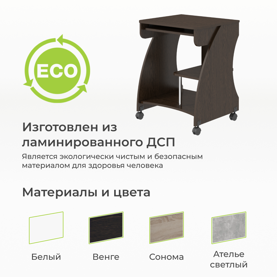 | Особенности | на колесах, надстройка, отделение для системного блока, полка для клавиатуры |