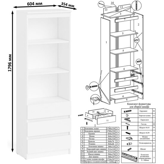 | Дополнительная информация | лицевая фурнитура отсутствует - все фасады открываются за край; пластиковые подпятники; выдвижные ящики на роликовых направляющих L=300 мм. неполного выдвижения; поставляется в разобранном виде в надёжной упаковке |