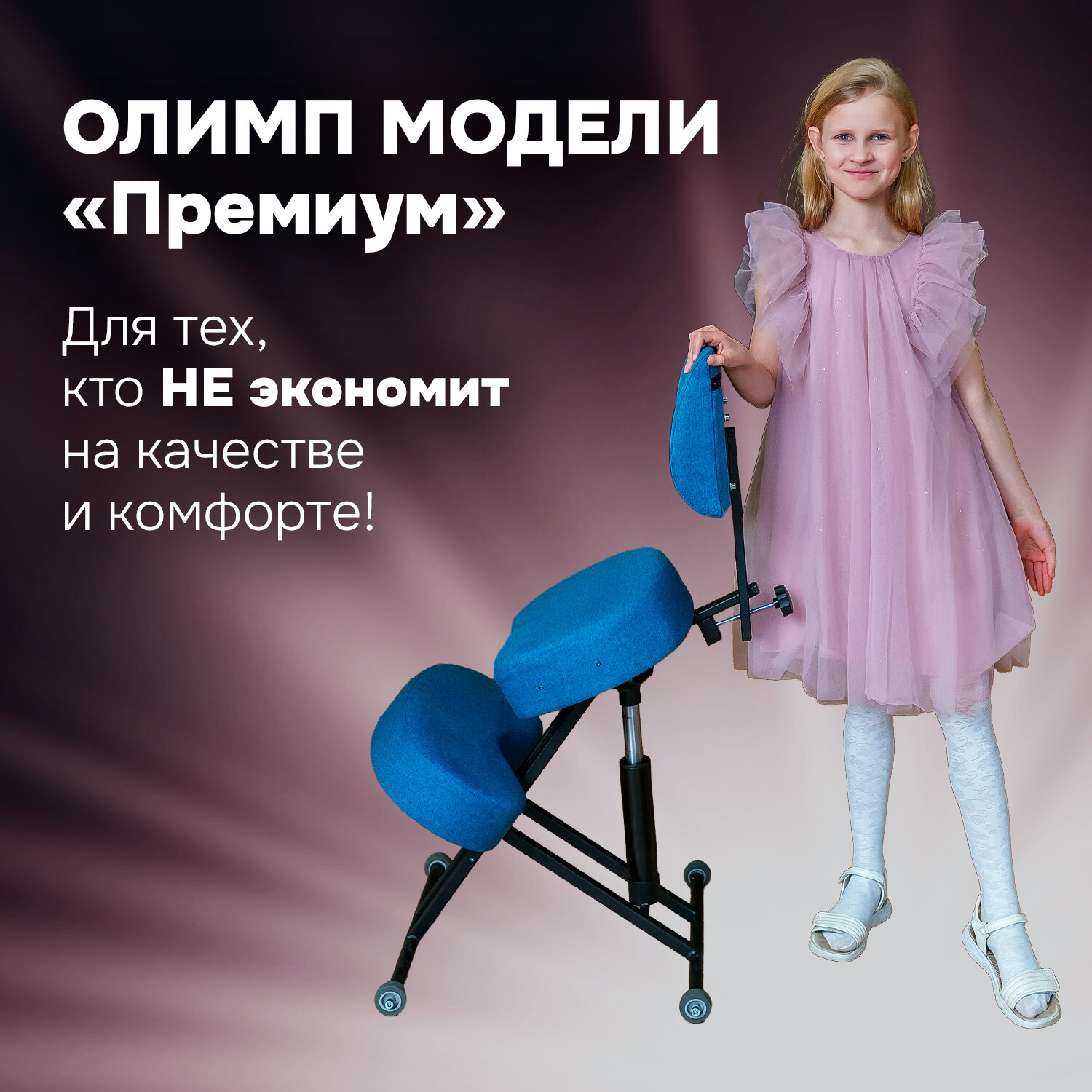 Коленный ортопедический растущий стул для осанки Олимп Премиум Лайт со спинкой, для школьника и взрослого, синий джинс интересное: