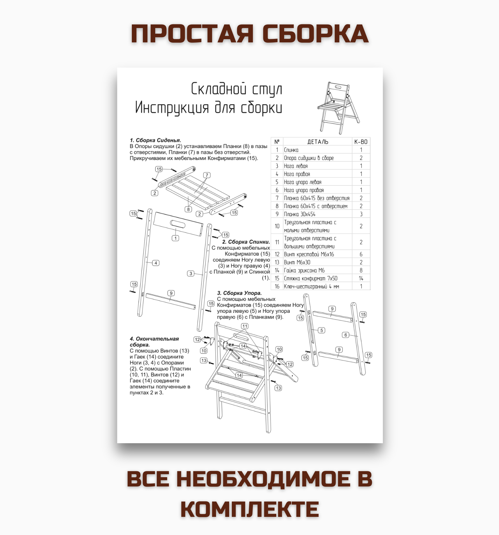 | Комплектация | стул складной, инструкция по сборке, метизы, шестигранник |