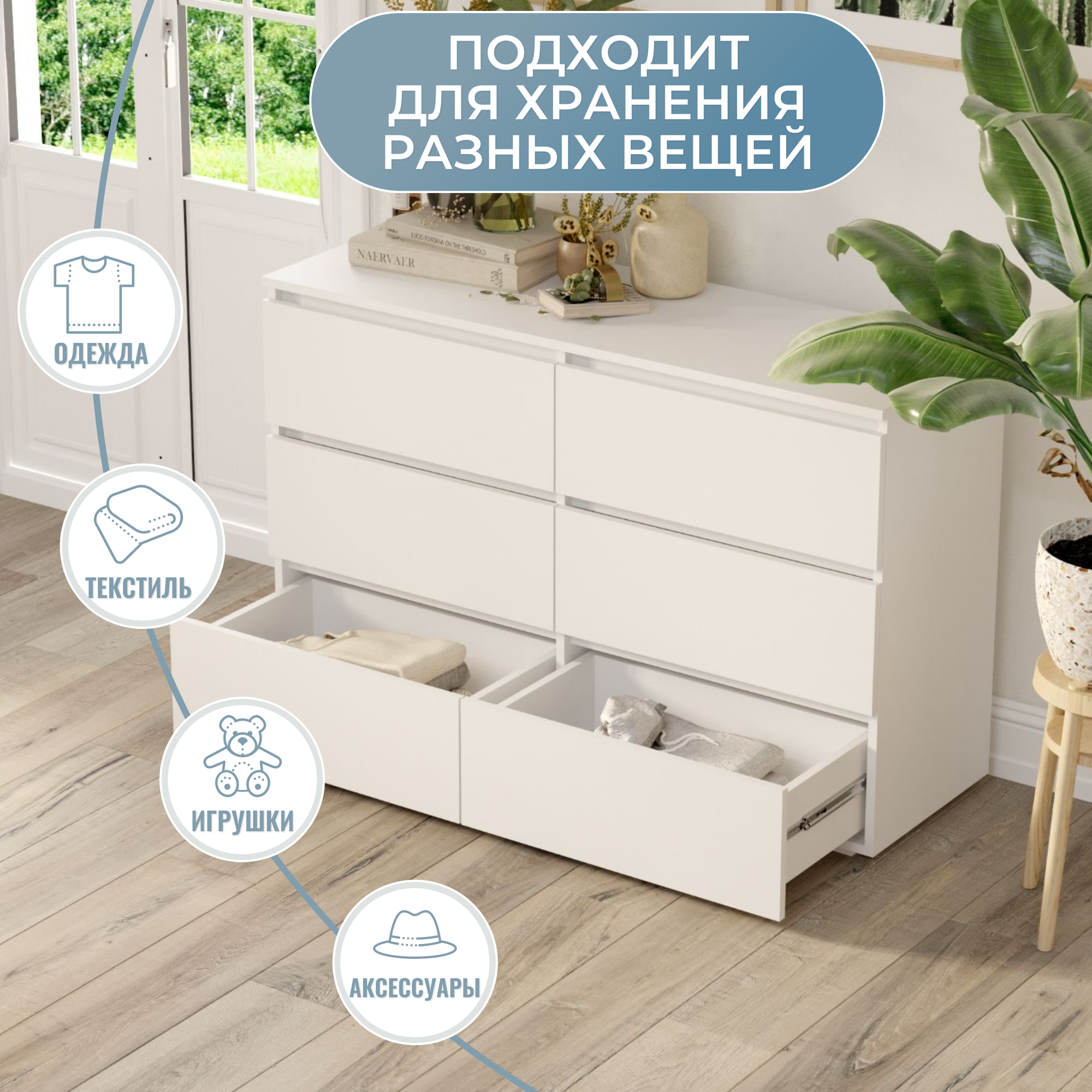 Комод A-A MEBEL "Сиэтл", 6 ящиков, 140 см х 40 см x 77 см, белый