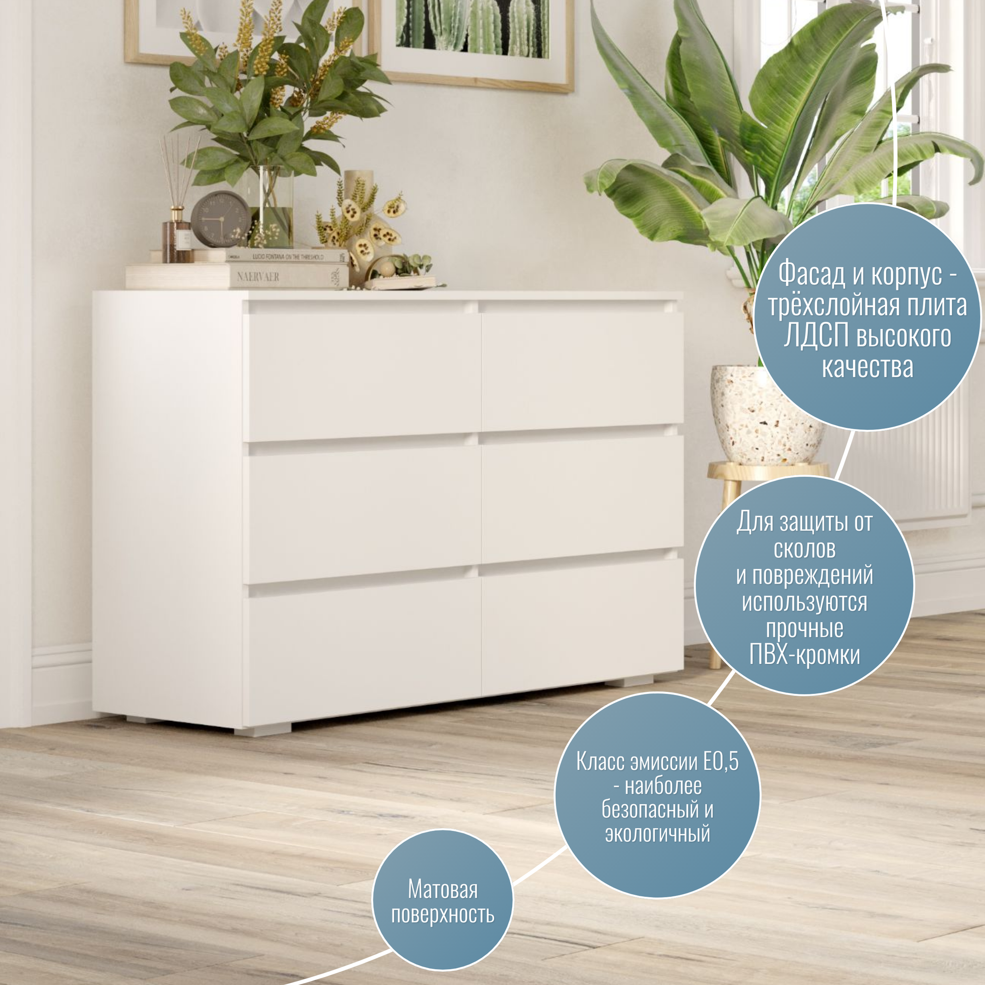 Комод A-A MEBEL Денвер, 6 ящиков, ЛДСП, белый, 160 см x 40 см x 80 см