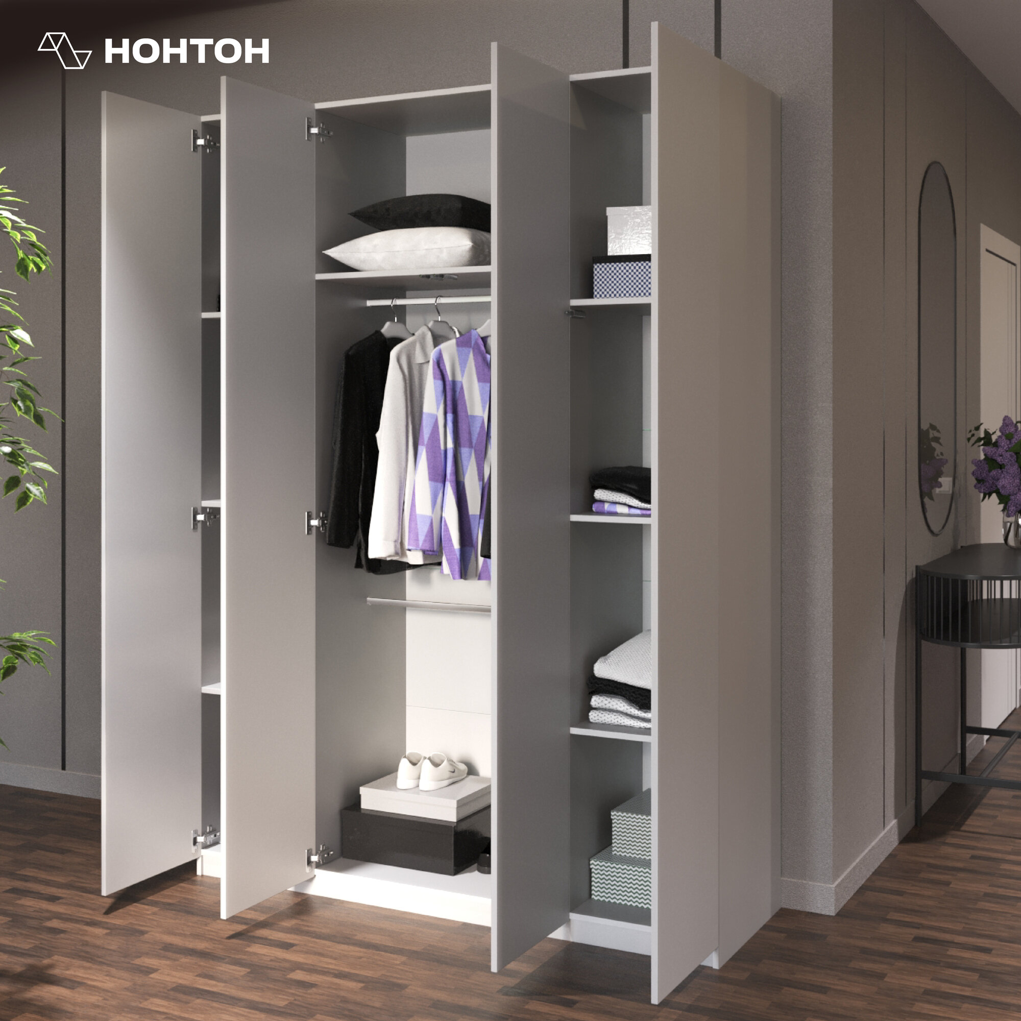 Шкаф для одежды распашной Нонтон Луас, 120 см, 7 полок и штанга, белый глянец