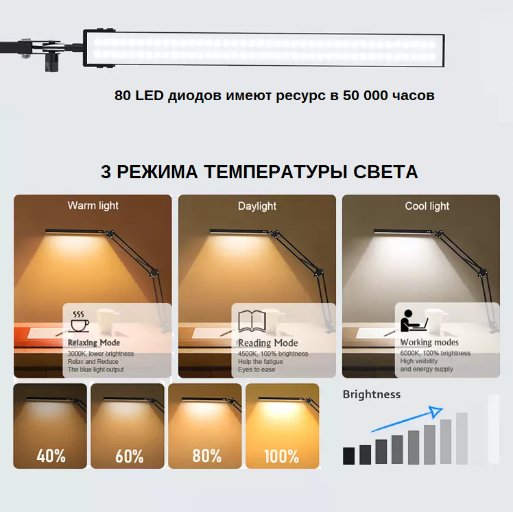 Лампа LED Light, настольная, хай-тек, складная, на струбцине, 80 светодиодов, чёрная, 2700K до 6400K, 10 уровней яркости интересное: