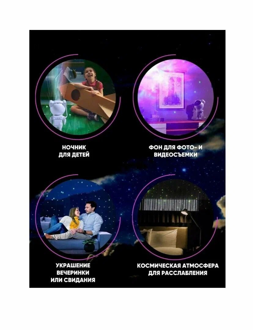 | Комплектация | ночник-проектор звездного неба, подставка, пульт ДУ, адаптер, инструкция |