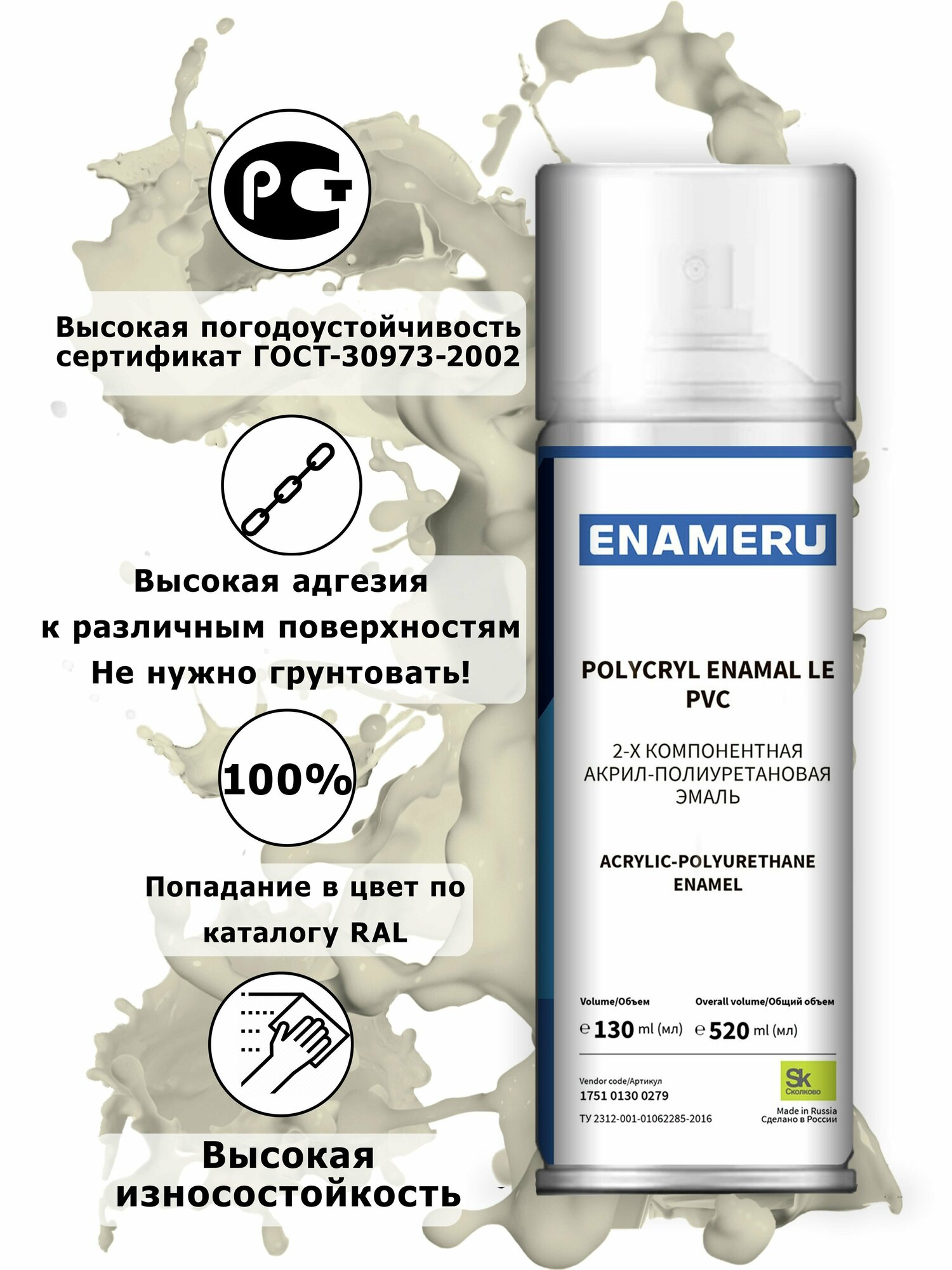 Структурная краска для ПВХ, пластика, окон Энамеру, Быстросохнущая, Акрил-полиуретановая, Полуматовая, 0.52 л, Бежевый RAL 1001