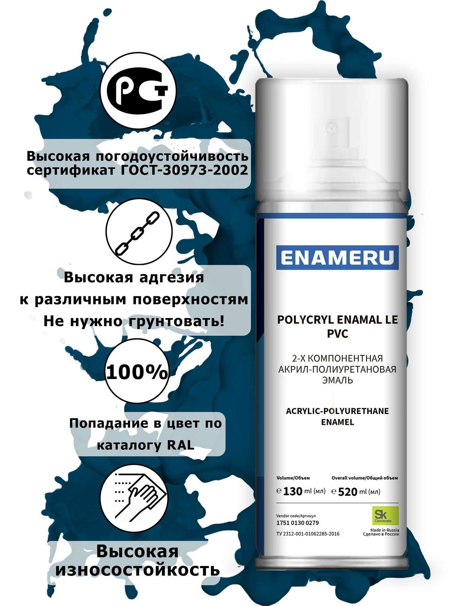 Структурная краска для ПВХ, пластика, окон Энамеру, Быстросохнущая, Акрил-полиуретановая, Полуматовая, 0.52 л, Бриллиантово-синий RAL 5007