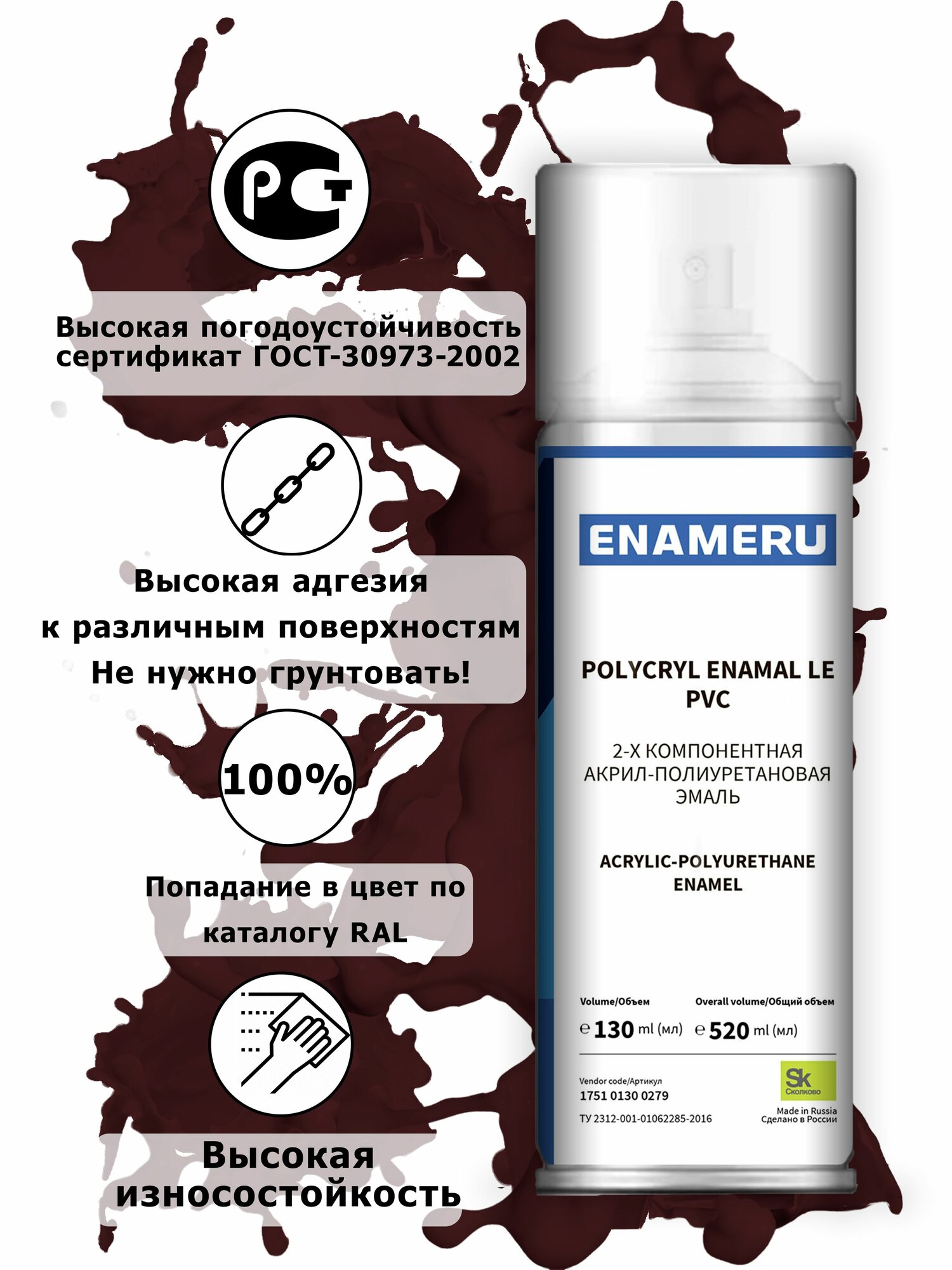 Структурная краска для ПВХ, пластика, окон Энамеру, Быстросохнущая, Акрил-полиуретановая, Полуматовая, 0.52 л, Красно-коричневый RAL 8012