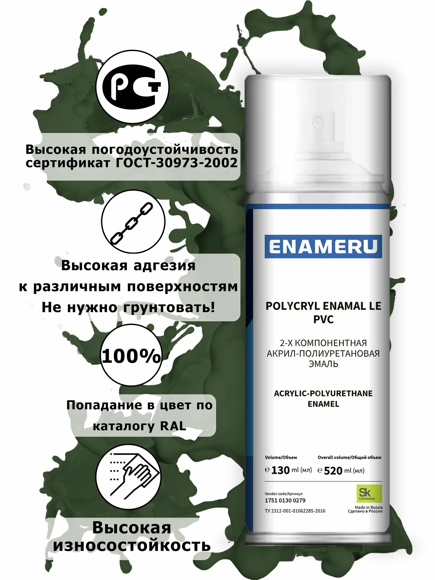 Структурная краска для ПВХ, Пластика Энамеру, Акрил-полиуретановая, Полуматовая, Хромовый зеленый RAL 6020, 0.52л