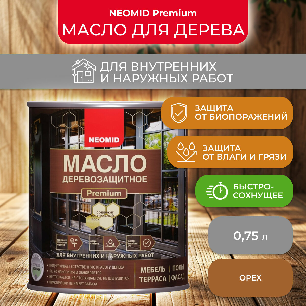 Масло с Натуральным Воском Neomid Premium 0.75л Красное Дерево Деревозащитное, Износостойкое для Внутренних и Наружных Работ / Неомид.