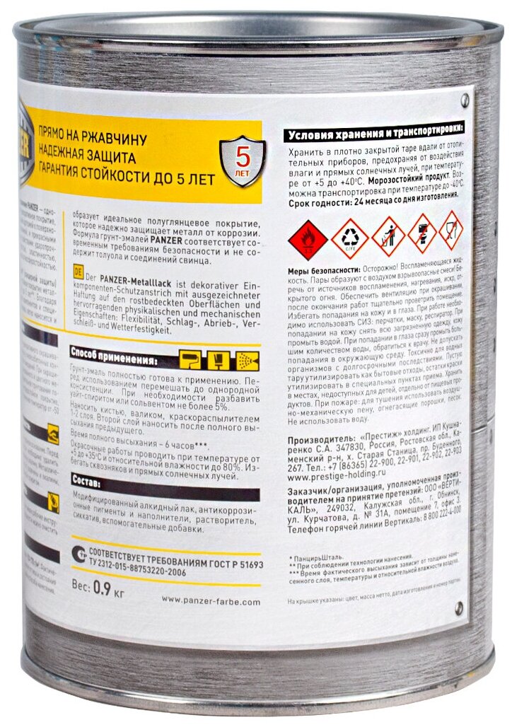 Грунт- эмаль ПО ржавчине гладкая "PANZER" БЕЛАЯ 5 КГ, полуглянцевая, 1ШТ, жестяная банка
