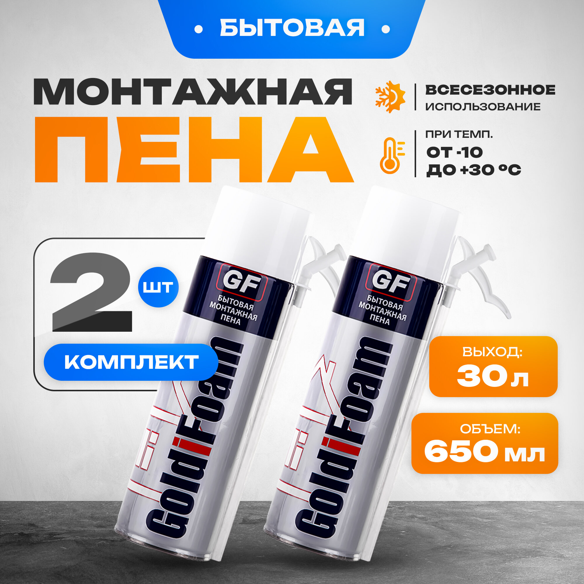 Монтажная бытовая пена Goldifoam mini с трубкой для выпуска пены, 650 мл., всесезонная, 2 шт.