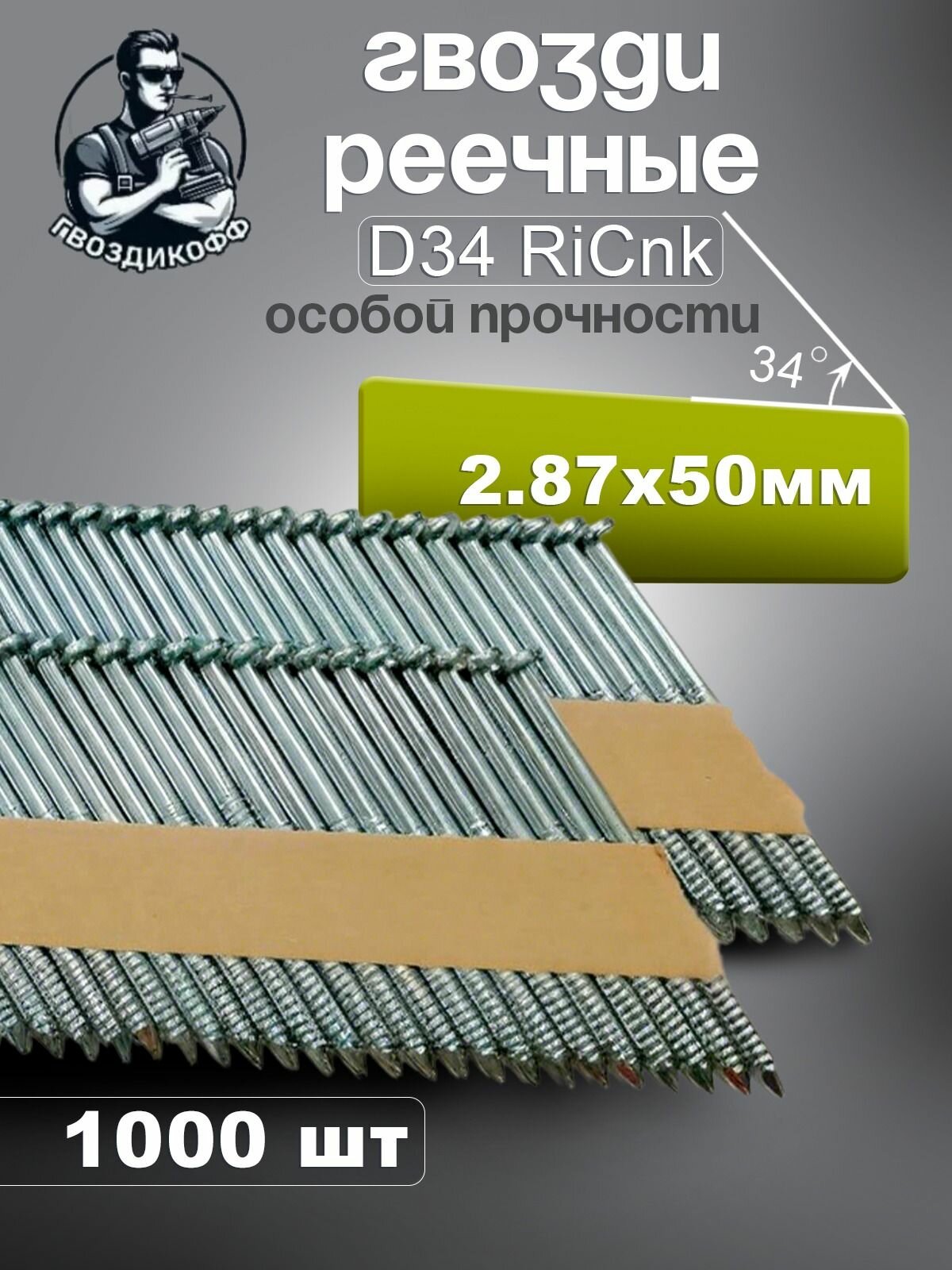 Гвозди реечные D34 2,87/50 мм оцинкованные с кольцевой накаткой RiCnk "Гвоздикофф", 400 шт