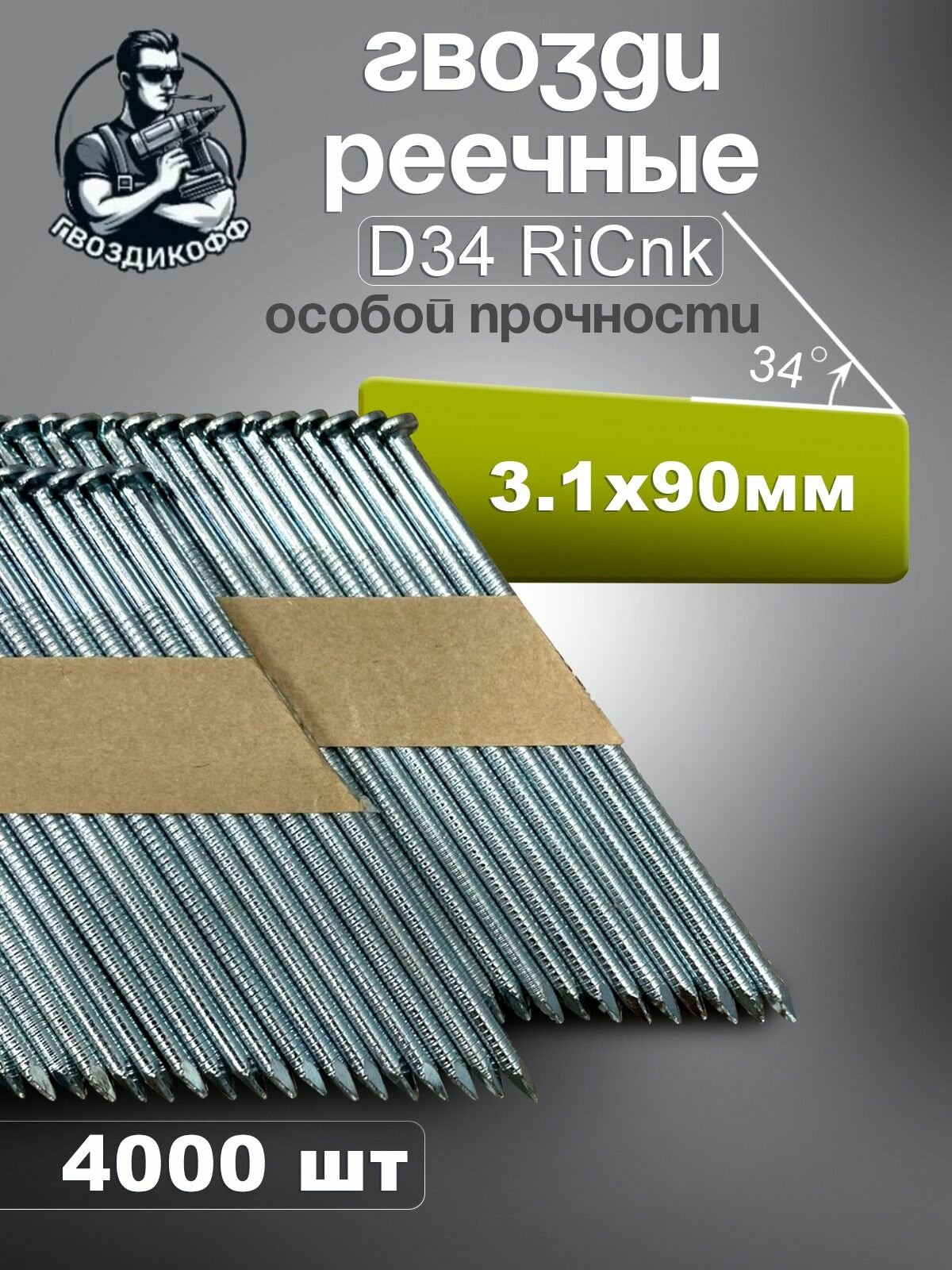 Купить Гвозди реечные D34 3,1/90 мм оцинкованные с кольцевой накаткой RiCnk "Гвоздикофф", 4000 шт