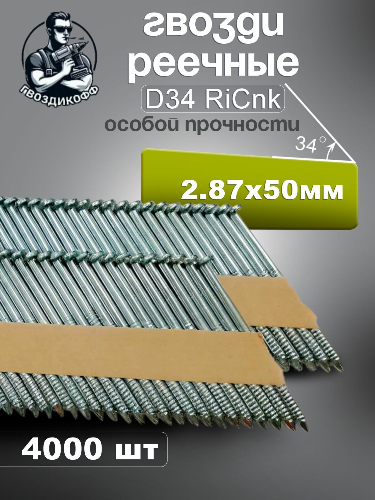 Гвозди реечные D34 2,87/50 мм оцинкованные с кольцевой накаткой RiCnk "Гвоздикофф", 400 шт