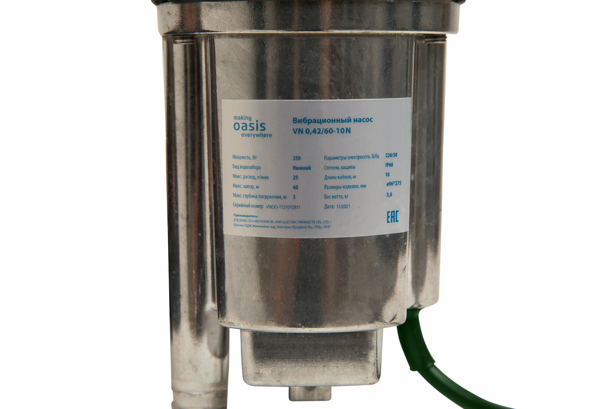 Насос погружной вибрационный making Oasis everywhere модель VN 0,42/60-16N, нижний забор, 250 Вт, 25 л/мин, напор 60 м, водяной, для колодца