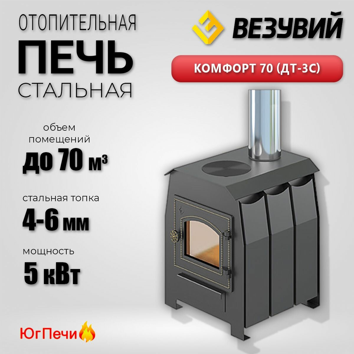 Дровяная печь ВЕЗУВИЙ "Комфорт 70", стальная, конфорка, чугунная дверца, 55x43x40 см интересное: