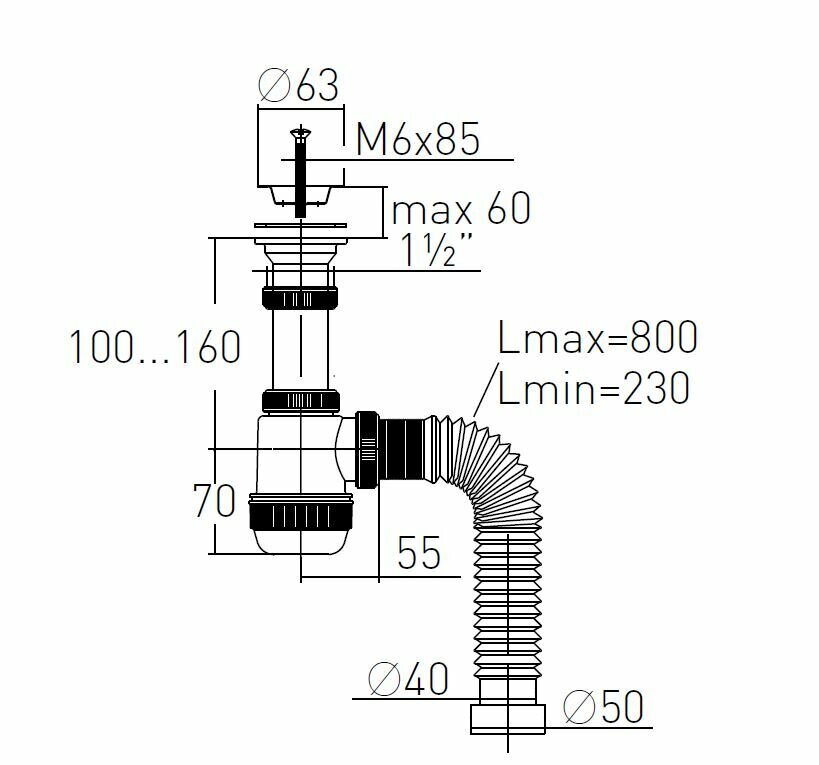 Сифон для раковины и умывальника в ванной комнате с литым выпуском и гибким соединением
