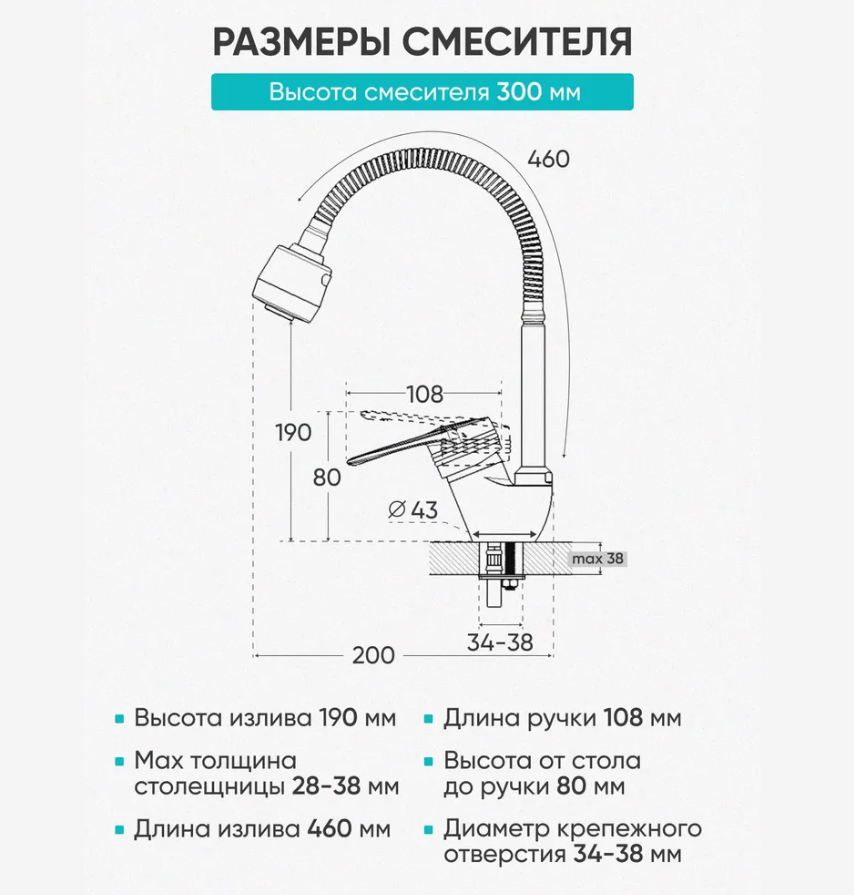 | Излив | гибкий, поворотный |