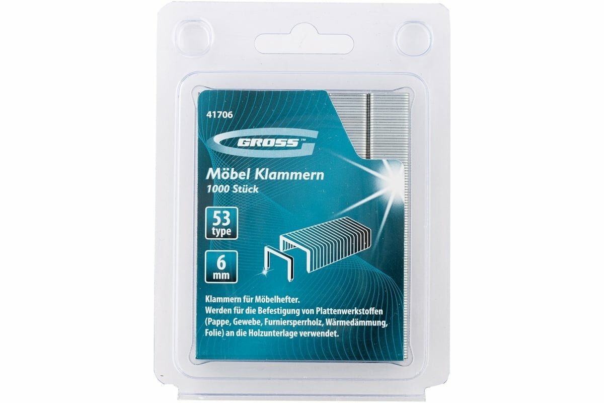 Скобы Gross 6 мм, для мебельного степлера, усиленные, тип 53, 1000 шт 41706