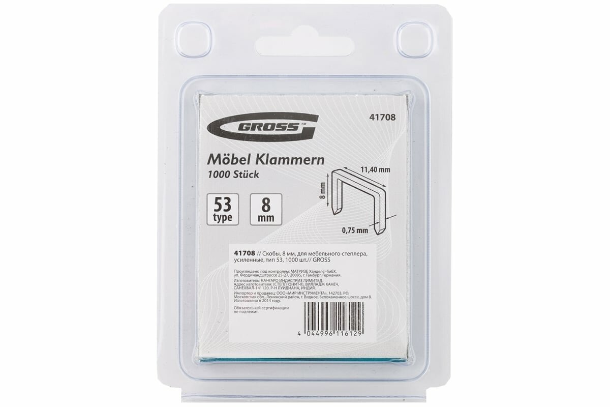 Скобы GROSS 8 мм, для мебельного степлера, усиленные, тип 53, 1000 шт. 41708 интересное: