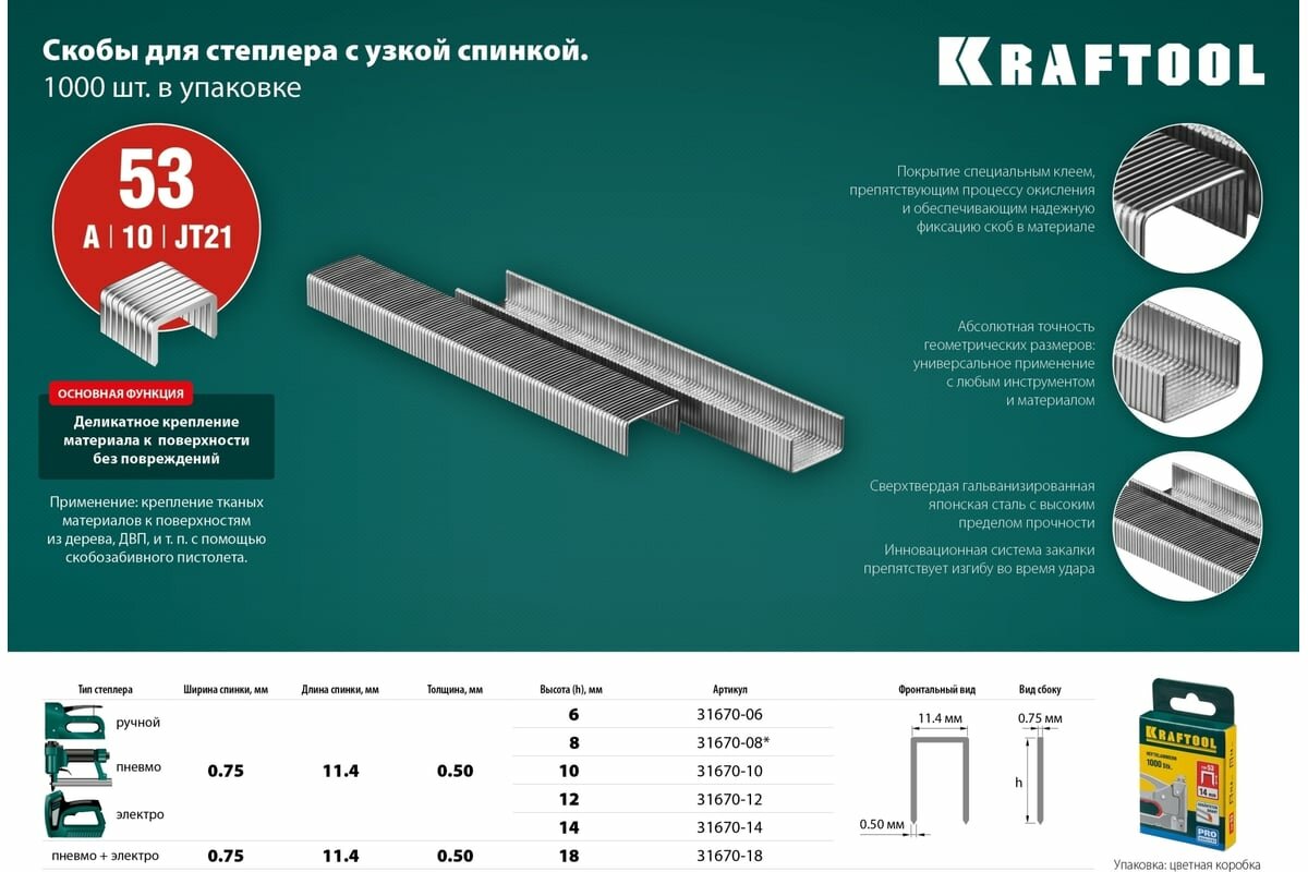 Скобы для степлера KRAFTOOL тип 53 (A /10 /JT21) 8 мм, 1000 шт, калибр 23GA, 31670-08 интересное: