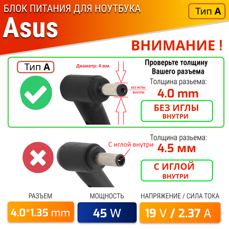 Блок питания (тип А) для Asus 19V 2.37A 45W / ADP-45BW / W16-045N3B / ADP-45AW / ux310u /ux31a / ux32 (4.0x1.35мм) 45W интересное: