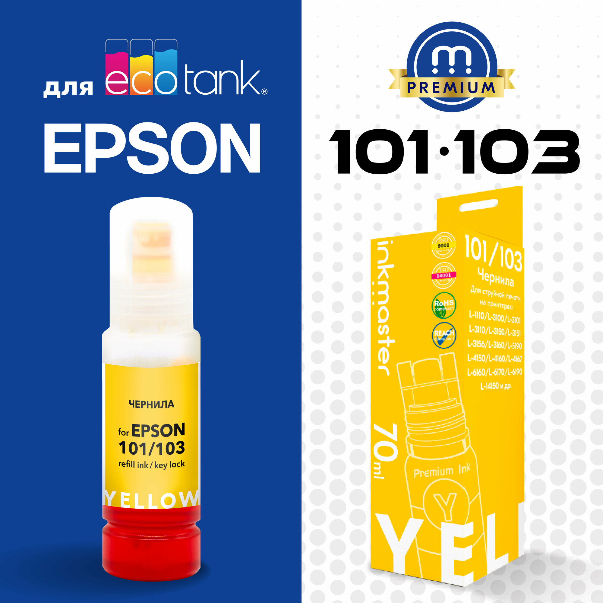 Чернила для принтера Epson 101/103 (L1110-L5290 и L1250-L6290), система Key Lock, желтый (C13T03V44A/C13T00S44A), 70 мл, совместимые Inkmaster