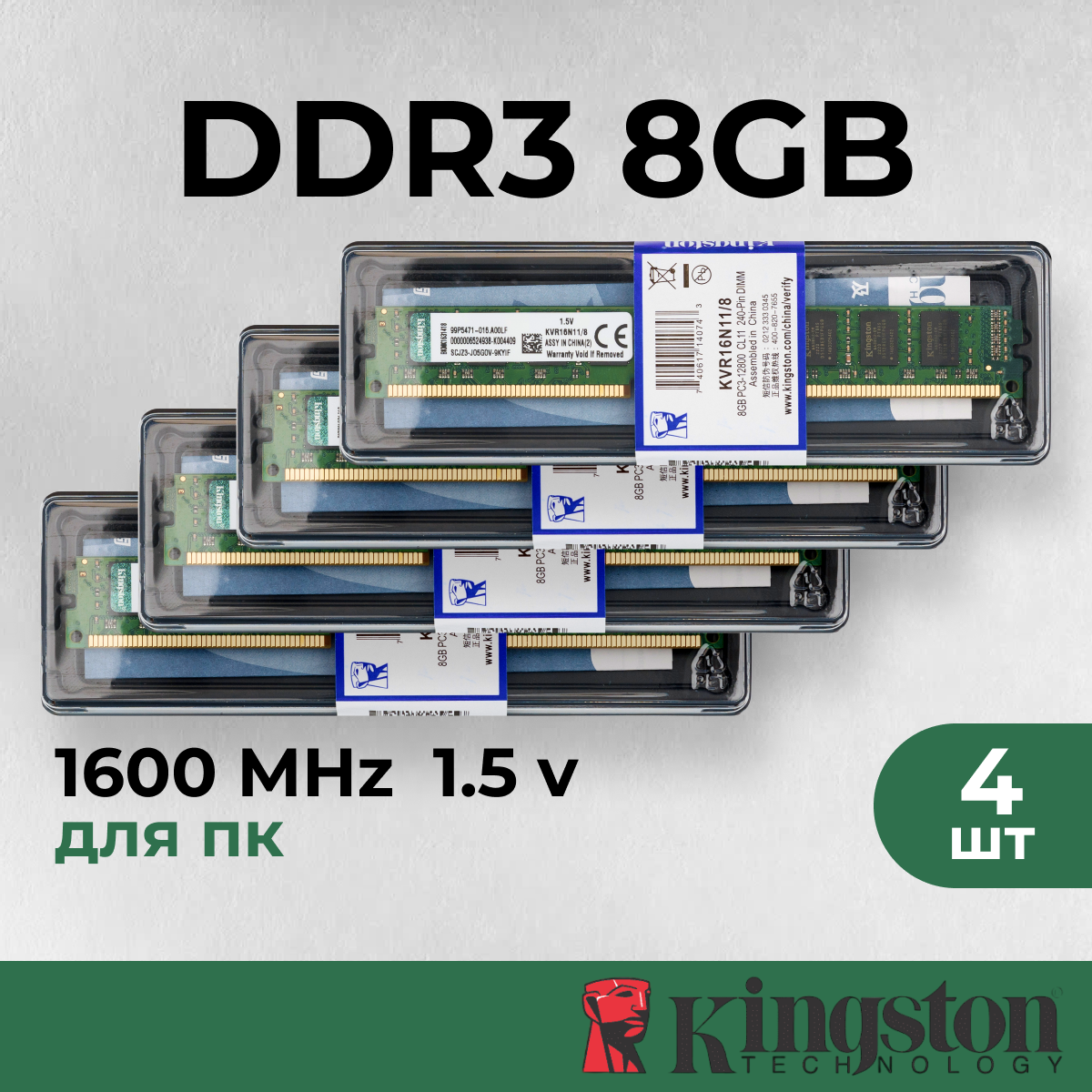 Купить Оперативная память для ПК Kingston DDR3 32 Гб (4шт по 8гб) 1600 МГц KVR16N11/8