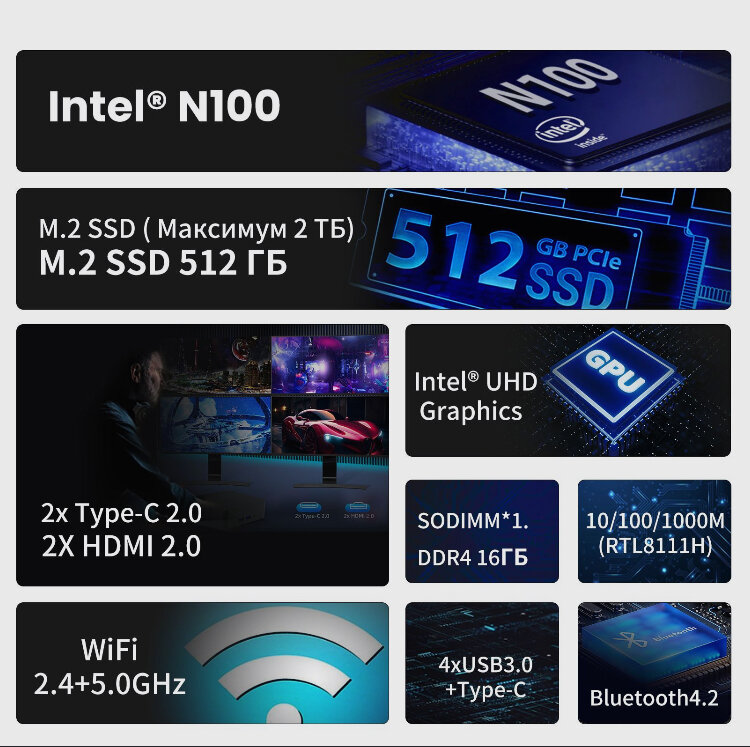 Мини-ПК Intel N100, 16ГБ ОЗУ, Windows 11, SSD 512ГБ, 4 ядра, чёрный интересное: