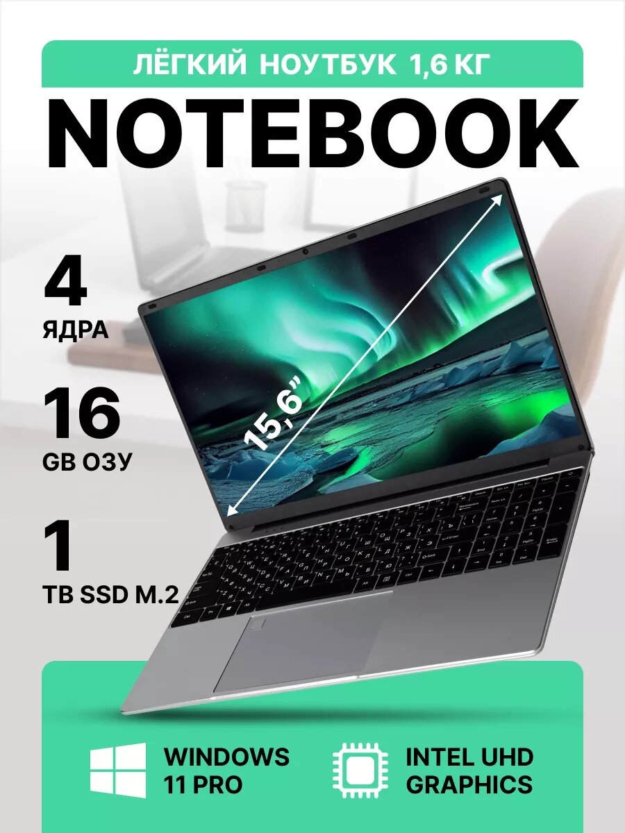 15,6 ноутбук Intel Celeron N5095 (до 2.9 GHz, 4 ядра), RAM 16 GB, SSD 1024 GB, Intel UHD Graphics, Русская клавиатура, Windows 11 Pro