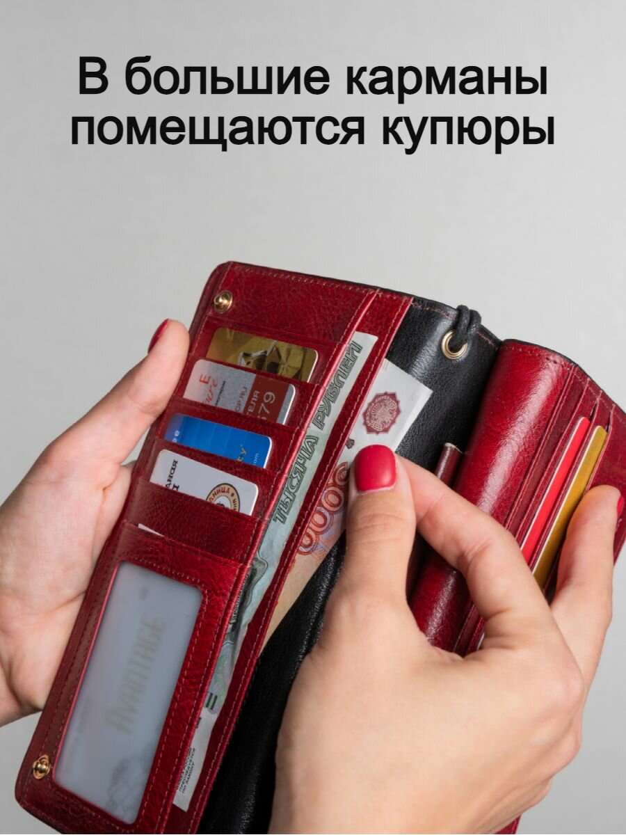 Большой кошелек женский из натуральной кожи красный для денег, телефона, карт, документов