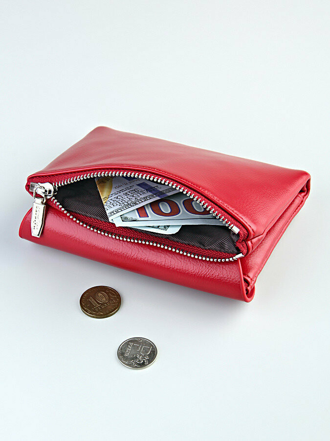 Кошелек женский, экокожа, гладкая фактура, на кнопке, отделения для карт и монет, внешний карман, красный