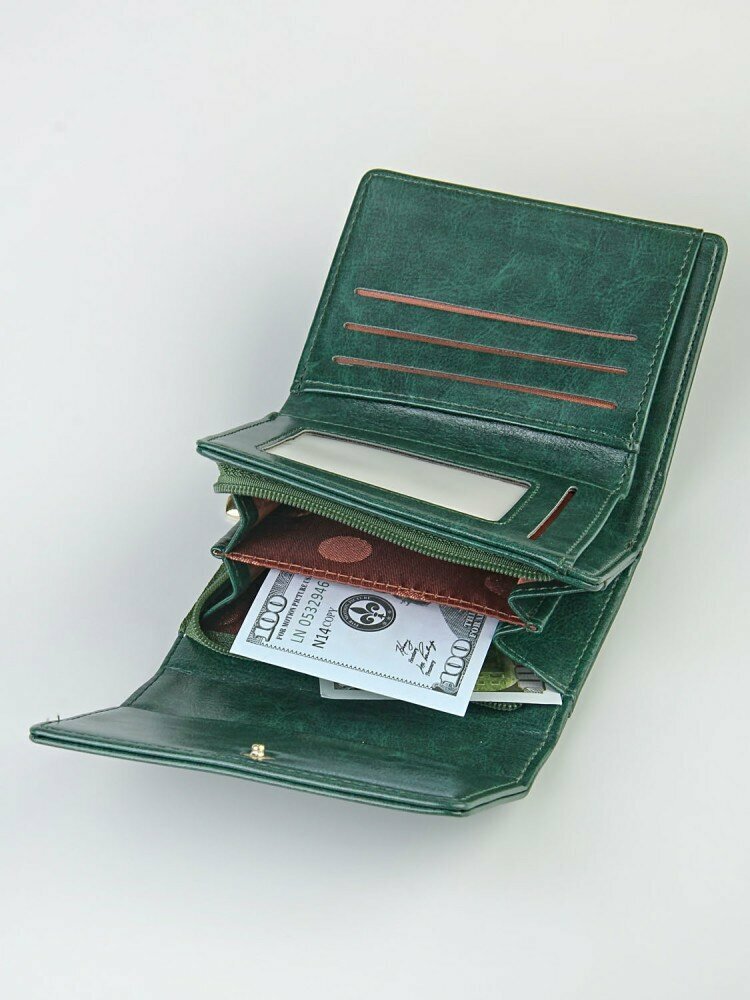 Кошелек женский, экокожа, гладкая фактура, на кнопке, отделения для карт и монет, скрытый карман, прозрачное окошко, зеленый