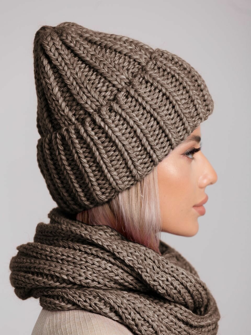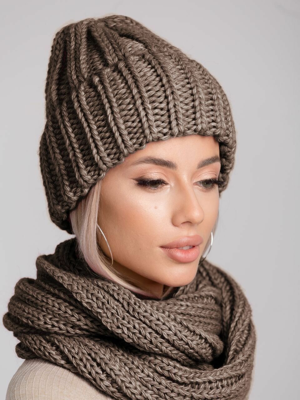 Комплект (шапка и снуд) женский, шапка вязаная бини с отворотом, теплый шарф зимний объемный крупной вязки