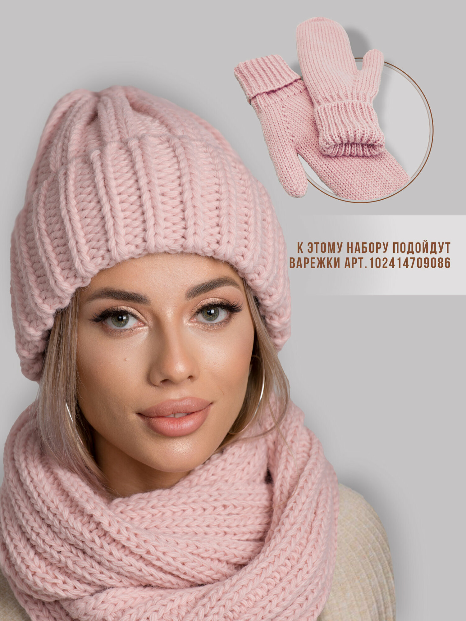 619688843 Комплект (шапка и снуд) женский, шапка вязаная бини с отворотом, теплый шарф зимний объемный