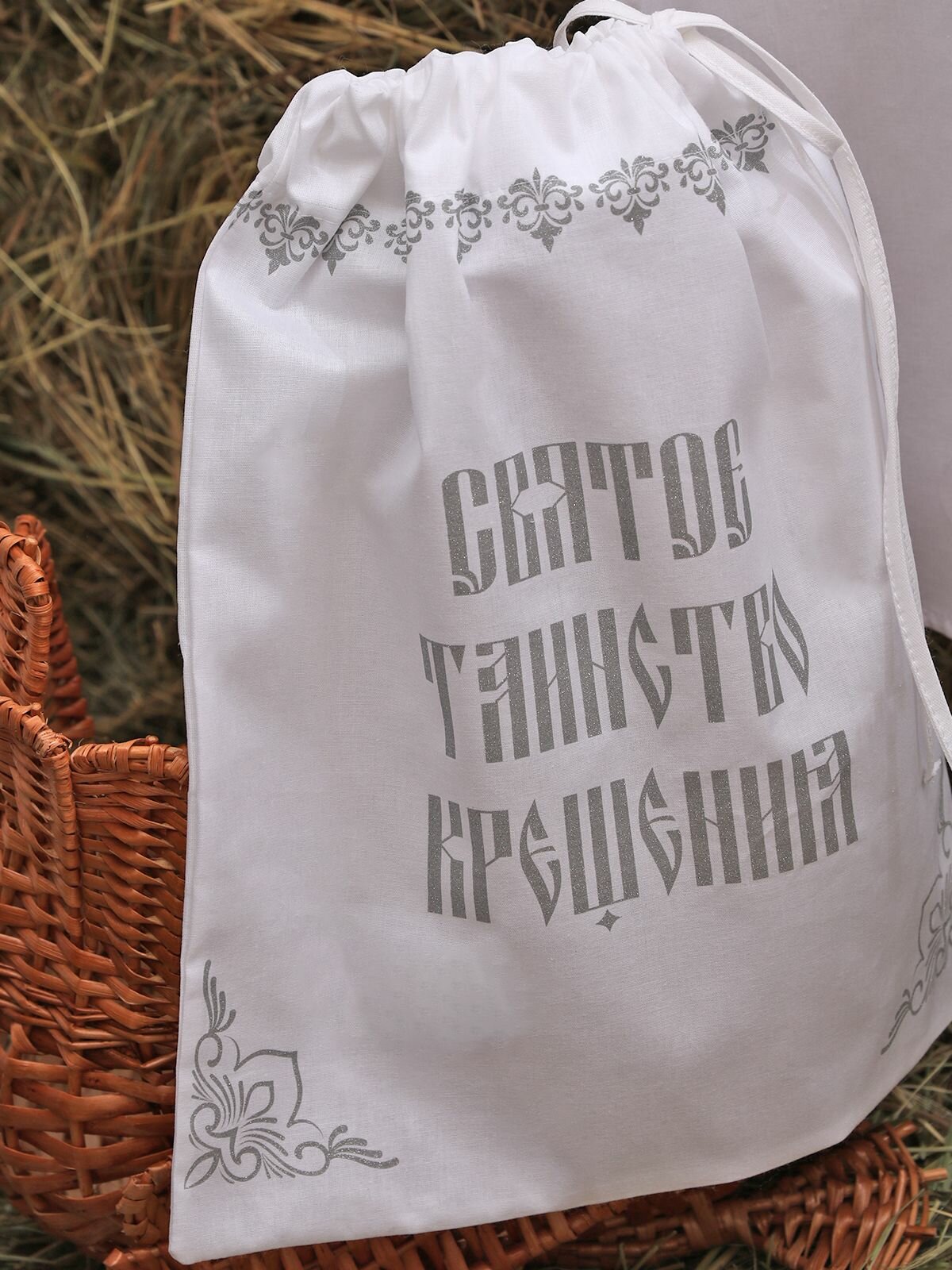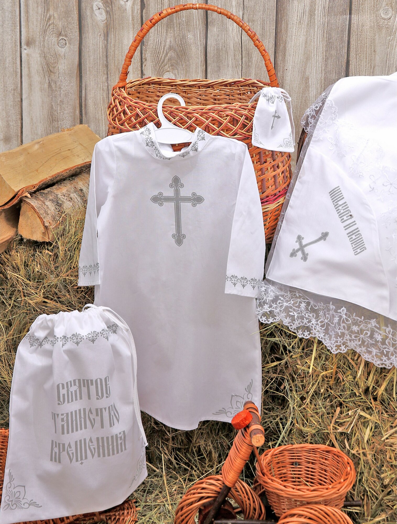 Крестильный комплект для мальчика 4-х предметный:рубашка, уголок, мешочек, мешочек для волос, серебряный