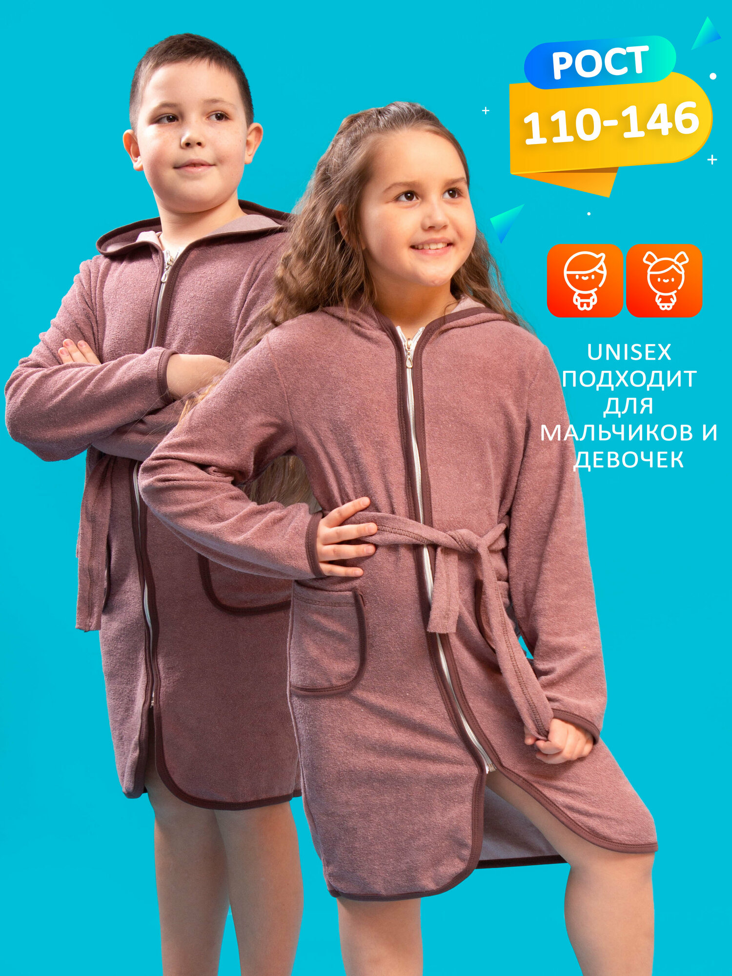 Халат детский банный домашний махровый с капюшоном на молнии