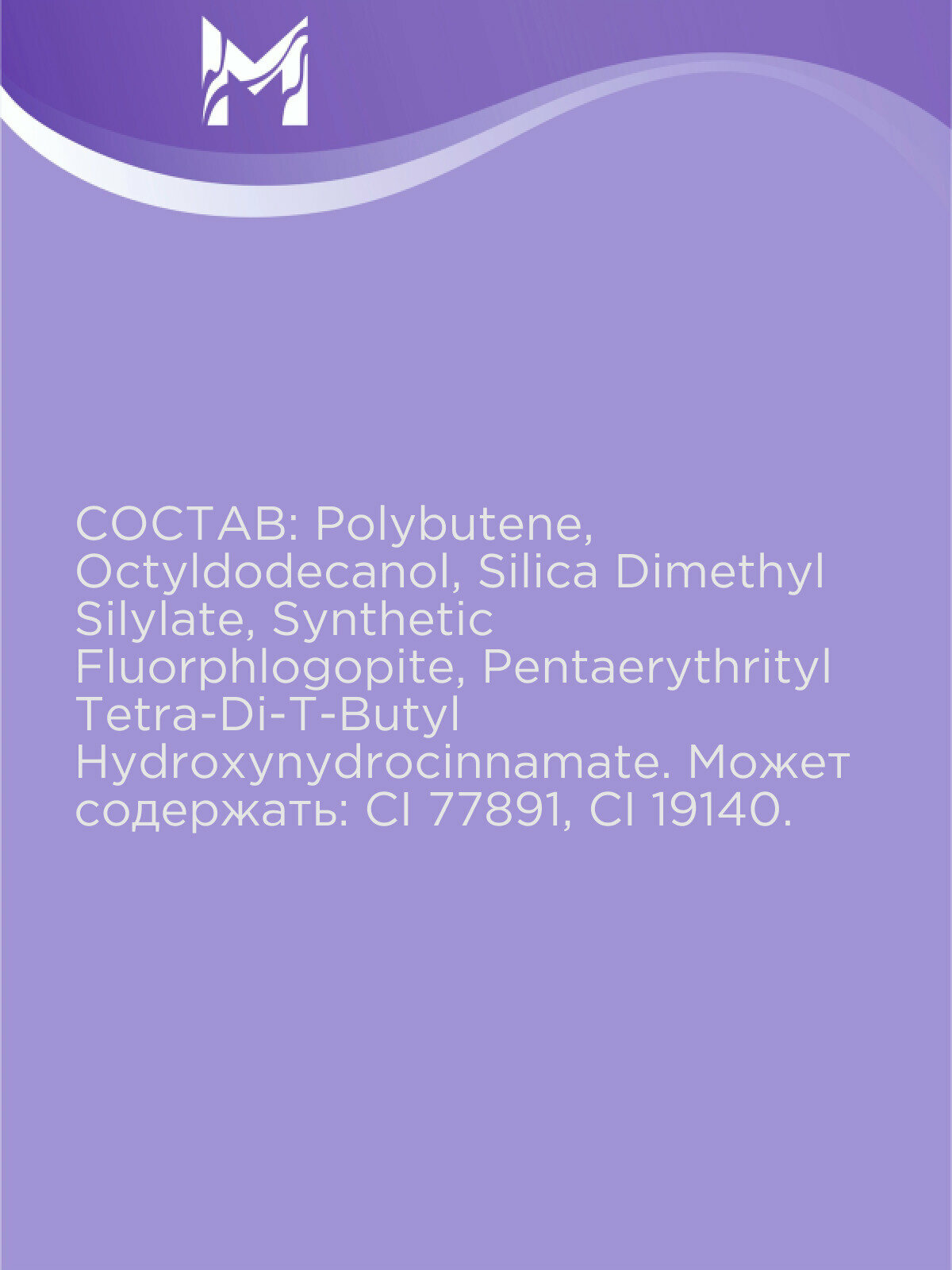 | Состав | Polybutene, Octyldodecanol, Silica Dimethyl Silylate, Synthetic Fluorphlogopite, Pentaerythrityl Tetra-Di-T-Butyl Hydroxynydrocinnamate. Может содержать: CI 77891, CI 19140. |