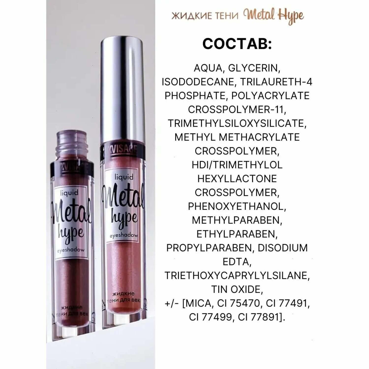 | Дополнительная информация | Жидкие тени для век Metal hype стойкие с металлическим сиянием. Насыщенные цвета с высоким содержанием перламутровых пигментов создают плотное мерцающее покрытие с первого слоя. Тени быстро высыхают, равномерно наслаиваются и растушевываются, сохраняют яркость цвета и сияние до 12 часов. Не требуют базы под тени. Содержат увлажняющие и смягчающие компоненты. |